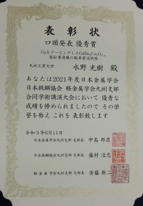 本学大学院生4名が「2021年度日本金属学会九州支部・日本鉄鋼協会九州支部・軽金属学会九州支部・合同学術講演会(オンライン)」において学生発表優秀賞を受賞しました。